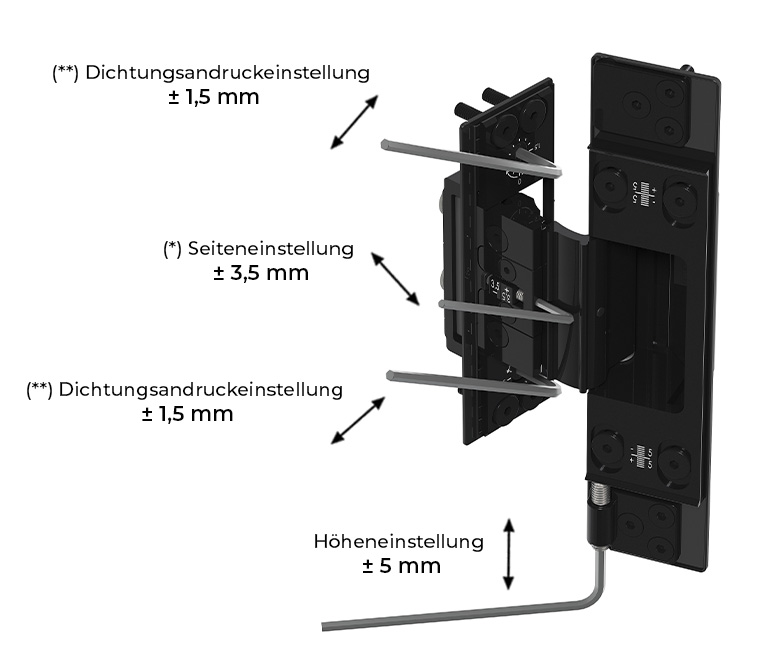 (**) - Der tatsächlich einstellbare Bereich kann aufgrund der je nach Aluminiumsystem verschiedenen Breite des Spalts an der Dichtung kleiner ausfallen.