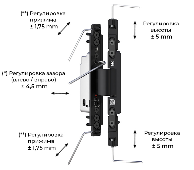 (**) - фактический диапазон регулировки на одном из направлений может быть меньше в зависимости от алюминиевой системы и ее ограничений